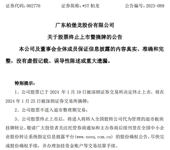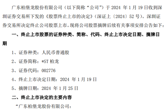 柏堡龙公司股票已于2024年1月19日被深圳证券交易所决定终止上市,在2024年1月25日被深圳证券交易所摘牌。公告显示,公司股票在2023年11月29日至2023年12月26日期间,通过交易系统连续二十个交易日的每日收盘价均低于1元,触及《股票上市规则(2023年修订)》第9.2.1条第一款第(四)项规定的股票终止上市情形。