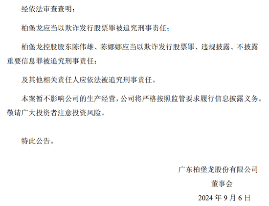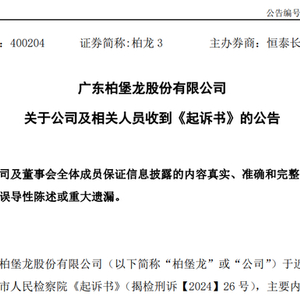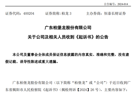近日,广东柏堡龙股份有限公司披露,公司及相关人员收到广东省揭阳市人民检察院《起诉书》。经依法审查查明,柏堡龙应当以欺诈发行股票罪被追究刑事责任;柏堡龙控股股东陈伟雄、陈娜娜应当以欺诈发行股票罪、违规披露、不披露重要信息罪被追究刑事责任;及其他相关责任人应依法被追究刑事责任。