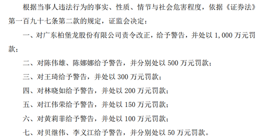 基于上述违法事实,柏堡龙被责令改正,给予警告并处以1000万元罚款;陈伟雄、陈娜娜知悉并参与财务造假行为,被给予警告,分别处以500万元罚款并被采取终身市场禁入措施。