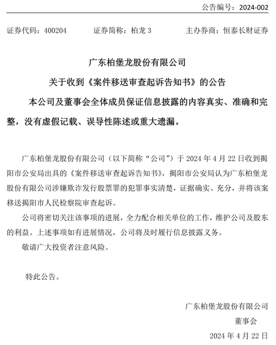 今年4月,广东柏堡龙股份有限公司披露关于收到《案件移送审查起诉告知书》的公告。揭阳市公安局认为广东柏堡龙股份有限公司涉嫌欺诈发行股票罪的犯罪事实清楚,证据确实、充分,并将该案移送揭阳市人民检察院审查起诉。