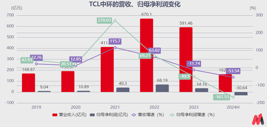 近日,TCL中环发布2024年半年报。上半年,TCL中环实现营业收入162.13亿元,同比下降53.54%;实现归母净利润-30.64亿元,同比下降167.53%。