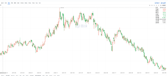 但从拉长周期来看,蒙牛乳业股价自2021年以来已经连续四年下滑。数据显示,2021年1月,蒙牛乳业股价最高涨至52港元,总市值高达2000亿港元。截至最近一个交易日收盘,蒙牛乳业股价报收于12.44港元,总市值仅为490亿港元,相比历史高点缩水幅度 超过75%。2024年至今,蒙牛乳业股价年内跌幅仍然高达37%,总市值缩水仅300亿港元。