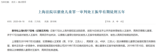 当天,新城控股(601155.SH)发布公告,确认原董事长王振华被刑事拘留;2019年7月10日,上海市普陀区检察院以涉嫌猥亵儿童罪对王振华批准逮捕;2020年6月17日,王振华因猥亵儿童罪被判处有期徒刑五年。