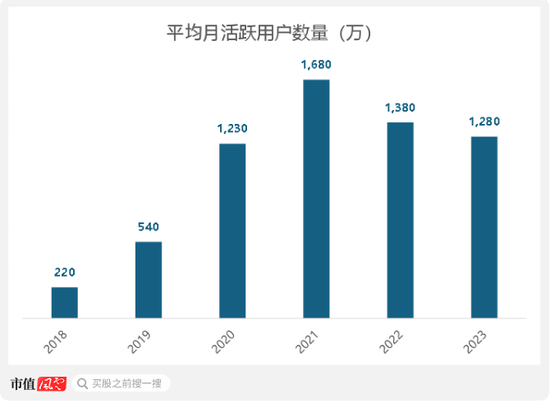 然而,为了顺应日益趋严的监管,趣丸集团也在加深平台整改,其TT语音APP时不时被要求下架,这导致平台活跃度有所下降,平均月活跃用户数从2022年开始呈现下降趋势。2023年,该数据已下滑至1,280万。