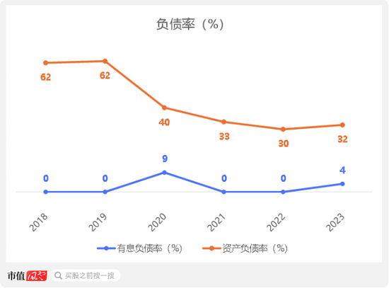 在有息负债方面,公司偶有少量的银行贷款。截至2023年末,有息负债率为4%。