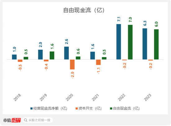 2022年和2023年,公司一方面明显下降了广告投入,另一方面也缩减了资本开支,分别使得经营现金流净额和自由现金流有了明显提升。