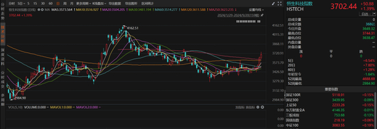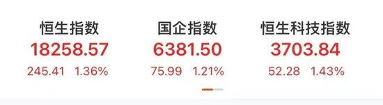 截至收盘,恒生指数涨1.36%,报18258.57点。恒生国企指数涨1.21%,报6381.5点。恒生科技指数涨1.43%,报3703.84点。
