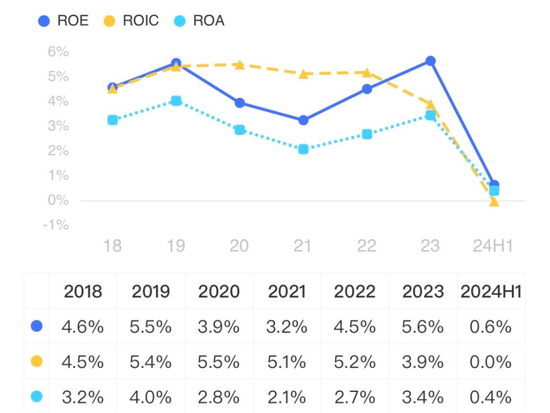 2018-23年,公司ROE在3%-6%之间,今年上半年仅为0.6%。