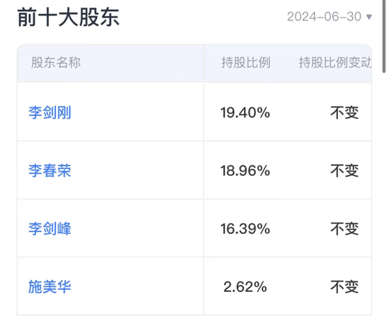 从股权结构来看,公司前十大股东均为自然人,控股股东和实际控制人均为李春荣、李剑刚、李剑峰以及施美华四人,其中施美华就是李春荣的妻子,截至6月30日,四人合计持有公司57.4%的股份。