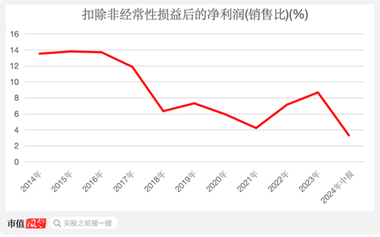 从扣非净利率来看,从上市的第一年就开始下降,到今年上半年仅为3.3%,较2016年下降超13个百分点。