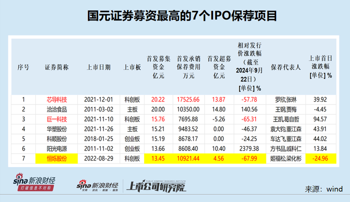 国元证券保荐的已上市项目中也存在诸多质疑,如部分超募资金越高、收费越高的IPO项目股价跌幅越大、业绩降幅越大甚至亏损。