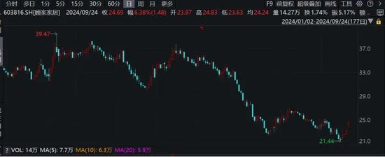 净利润下跌的同时,顾家家居在二级市场的表现也不乐观。去年下半年以来,顾家家居股价持续下降,今年以来跌幅进一步扩大。截至9月25日,顾家家居收盘价24.53元/股,与何剑锋投资的交易价36.72元/股相比跌幅已达33.2%。