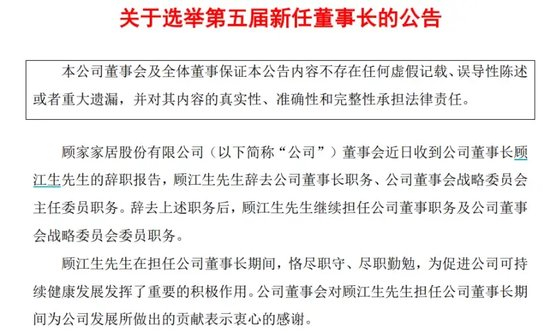9月22日,顾家家居公告称,董事长顾江生辞去了公司董事长、董事会战略委员会主任委员职务,不过还会继续担任公司董事和董事会战略委员会委员。
