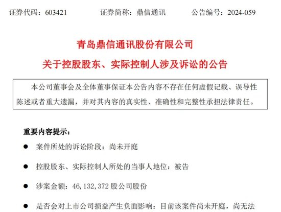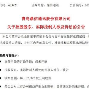 9月26日,鼎信通讯发布公告,称收到控股股东、实际控制人王建华通知,其前妻张启将其诉至法院,要求解除前期离婚协议中约定的股份代持协议,并确认该股份由张启所有,涉及的股份达4613.24万股。