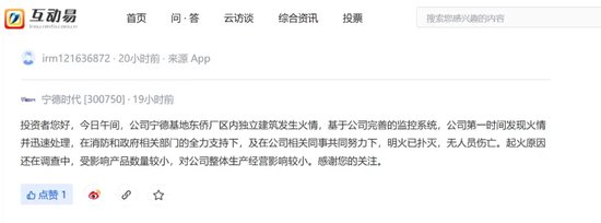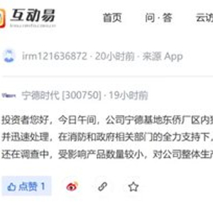 当日深夜,宁德时代在互动平台回应称,午间,公司宁德基地东侨厂区内独立建筑发生火情,基于公司完善的监控系统,公司第一时间发现火情并迅速处理,在消防和政府相关部门的全力支持下,及在公司相关同事共同努力下,明火已扑灭,无人员伤亡。起火原因还在调查中,受影响产品数量较小,对公司整体生产经营影响较小。