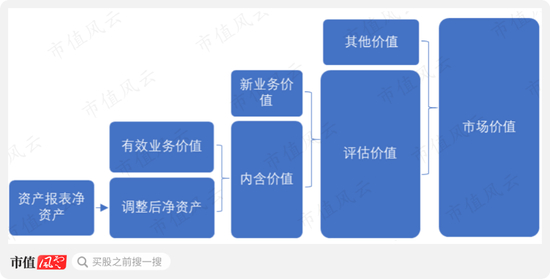 简单来说,内含价值由在手保单扣除偿付能力额度后的利润折现值加上调整后净资产组成。内含价值类似于寿险公司的清算价值。