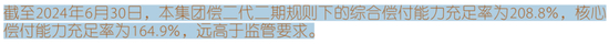 不过,经过了两年的调整与适应,平安的资本结构调整基本完成。截至2024年6月末,平安的综合偿付能力充足率为208.8%,核心偿付能力充足率为164.9%,远高于监管要求(分别为100%、50%)。