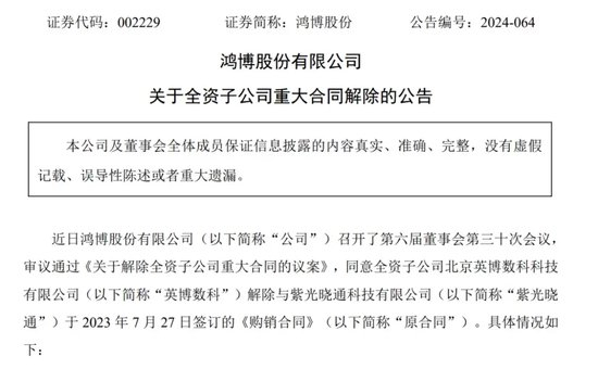 10月11日晚间,鸿博股份公告称,因宏观环境变化,全资子公司北京英博数科科技有限公司(简称“英博数科”)与紫光晓通科技有限公司(简称“紫光晓通”)解除了购销合同。