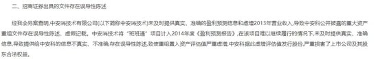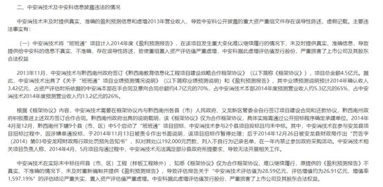 经查,中安消技术作为重大资产重组的有关方,将“班班通”项目计入盈利预测,但在该项目发生重大变化难以继续履行的情况下,未及时重新提供《盈利预测报告》,导致其评估值严重虚增,并且虚增2013年营业收入5515万元。中安科据此披露的重大资产重组文件存在误导性陈述、虚假记载。