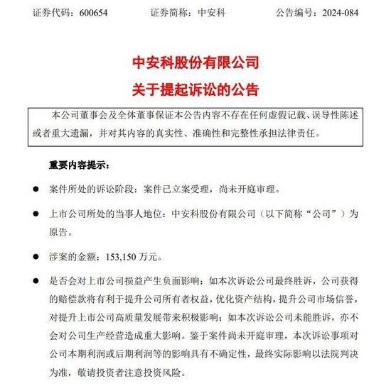 2024年10月10日,中安科公司收到了上海金融法院送达的《受理通知书》(2024)沪74民初884号。截至公告披露日,该案件尚未开庭审理。