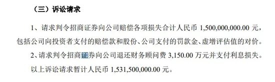 此外,中安科请求判令招商证券向公司退还财务顾问费3150万元并支付利息损失。以上诉讼请求暂计15.315亿元。