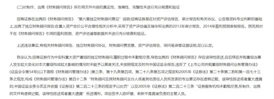 2022年8月,招商证券遭证监会立案调查。同年9月,证监会对招商证券下发《行政处罚决定书》。证监会认为,招商证券在出具的《财务顾问报告》“第六章独立财务顾问意见”说明:招商证券是在对资产评估报告、审计报告和有关协议、公告等资料专业判断的基础上,出具了独立财务顾问报告;在置入资产定价公平合理性相关分析中,采用了资产评估值及瑞华所出具的2013年审计报告、2014年盈利预测审核报告。然而其对于在《财务顾问报告》引用的盈利预测、资产评估值等数据并未进行充分核查和验证。