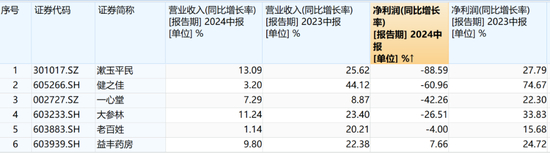 A股6家医药零售上市公司——老百姓(603883.SH)、一心堂、大参林(603233.SH)、益丰药房(603939.SH)、健之佳(605266.SH),以及漱玉平民,发布的2024半年报数据显示,6家医药零售上市公司营收均出现下滑,除益丰药房之外,净利润增长也都转负。其中,营收增速最快的是漱玉平民,为13.09%,但其净利润增长率为-88.59%,排在第6位。
