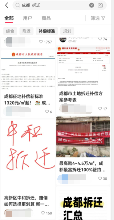 不仅仅是资本市场,同样火爆的还有社交平台。小红书上,很多成都网友分享近期各自的拆迁补偿情况。有的家庭拆迁拿到900多万,有的拿了17套房,还有三年房租。随后,成都大规模拆迁话题火了,#成都拆迁#也上了微博热搜。