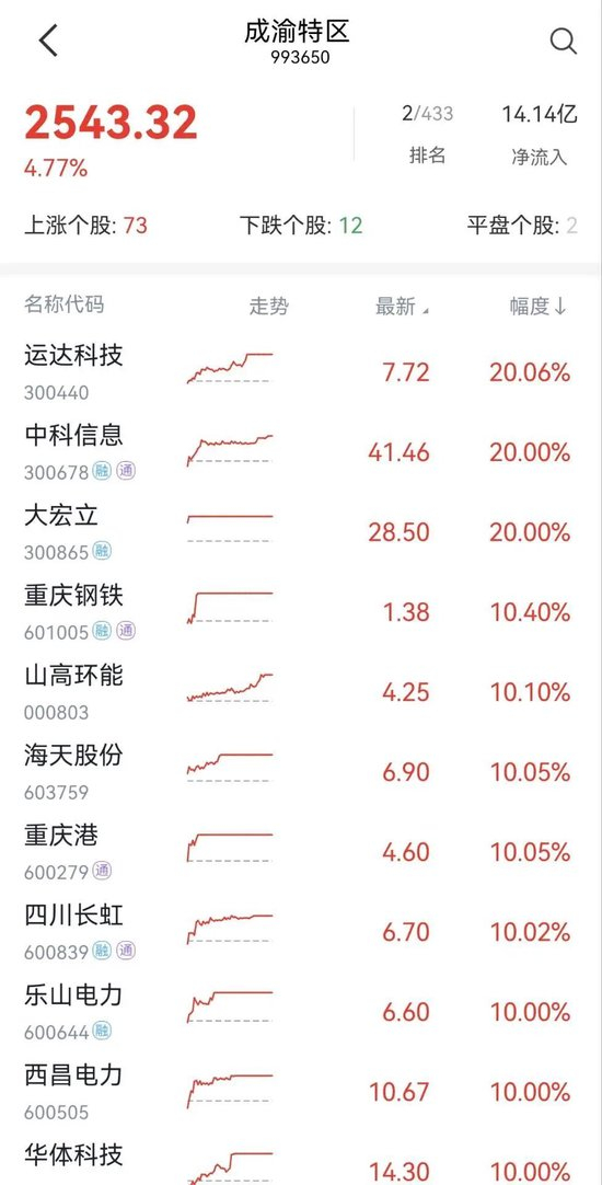但在一片低迷之中,成渝特区概念股掀起涨停潮。具体来看,远达科技、大宏立、中科信息20cm涨停,重庆钢铁、山高环能、重庆港、海天股份、四川长虹、西昌电力、华体科技、乐山电力、高新发展、四川双马、明星电力、中交地产、四川九洲、渝开发、四川路桥、四川金顶、四川成渝、渝三峡A等几十只股涨停。