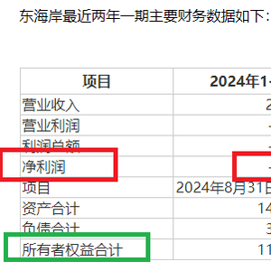 2022年年末和2023年年末,并购标的东海岸的所有者权益分别为-14.31亿元、-16亿元,连续两年资不抵债。截至2024年8月末,东海岸所有者权益为11.08亿元,转为正值。东海岸整体12亿元的估值较11.08亿元的所有者权益,高出近亿元。