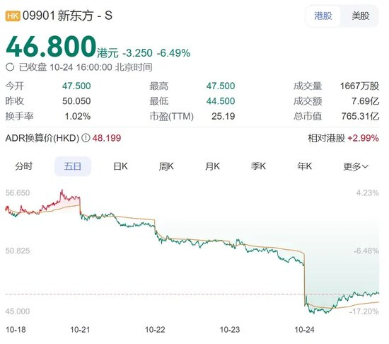 财报公布后,由于对二季度的指引低于市场预期,新东方美股的股价大幅低开超4%,最终收跌8.42%至61.48美元/股。10月24日,新东方港股股价亦大幅低开8%,最终收跌6.49%至46.8港元/股。
