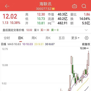 截至10月25日收盘,海联讯股价报12.02元/股,总市值约40.3亿元。
