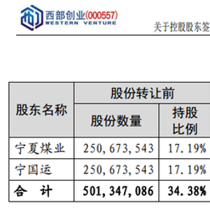 11月6日,宁夏国有资本运营集团有限责任公司(以下简称宁国运)与宁夏煤业签署《股份转让协议》约定,宁国运拟将所持西部创业5%的股份,协议转让给宁夏煤业。