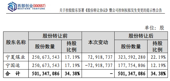 西部创业公告称,若完成上述股份转让,公司控股股东将由宁国运变为宁夏煤业,实控人将由宁夏回族自治区人民政府变为国家能源集团。