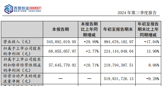 西部创业的归母净利润、扣非后净利润,2024年前三季度同比分别增长13.90%、8.06%,但2024年第三季度同比分别下降2.77%、20.71%。