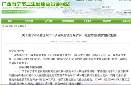 2022年11月4日,南宁市卫健委发布《关于南宁市儿童医院PPP项目实施情况专项审计调查发现问题的整改报告》,报告显示,南宁市儿童医院3P项目存在多达12项违规问题。