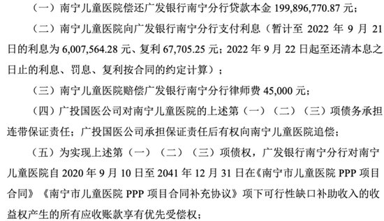 《整改报告》发布4天后,2022年11月8日,广发银行南宁分行以南宁儿童医院违约为由,主张宣布上述贷款全部提前到期,并向南宁中院提起诉讼。