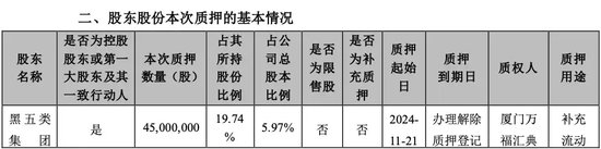 11月19日,黑五类集团持有的黑芝麻1.16%股份被解除质押,11月21日,黑五类集团又将5.97%的股份质押给厦门万福汇典当有限公司,质押用途为补充流动资金。