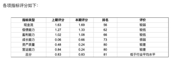 具体而言,黑芝麻的现金流、偿债能力和盈利能力分别被评为“较弱”“较低”和“较低”,且排名分别为第56位、第62位和第66位。此外,成长能力被评为“很弱”,排名为第73位;资产质量和营运能力则被评为“较差”,排名均为第80位。总评分为0.83,排名为第81位,整体水平低于行业平均水平。