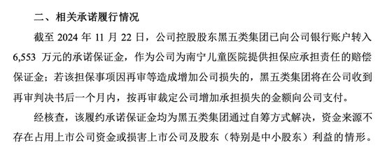 11月22日晚,黑芝麻发布公告称,因为南宁儿童医院提供违规担保,控股股东黑五类集团需要在向黑芝麻支付6553万元的承诺保证金,赶着11月22日的最后一天期限,这笔资金终于到账。黑芝麻也因此逃过被ST的命运。