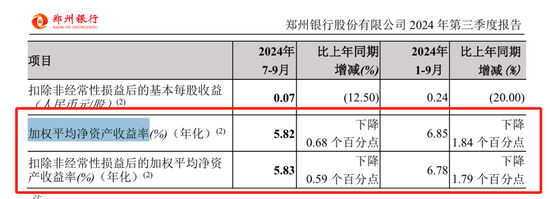 ROE(加权平均净资产收益率)是衡量企业盈利能力的重要指标。郑州银行2024年三季报显示,2024年第三季度,郑州银行的ROE 为5.82%,同比下降0.68个百分点,扣非后的ROE为5.83%,同比下降0.59个百分点;2024年前三季度,郑州银行ROE为6.85%,同比下降1.84个百分点,扣非后的ROE 为6.87%,同比下降1.79个百分点。