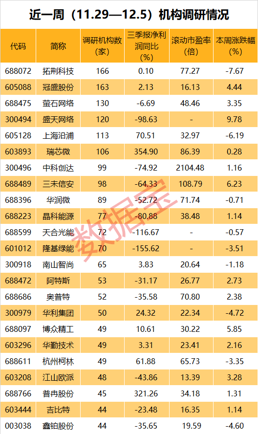芯片概念股拓荆科技机构关注度位居第一,合计166家机构调研了该公司,包括66家基金公司、36家证券公司、12家私募、10家险资等。