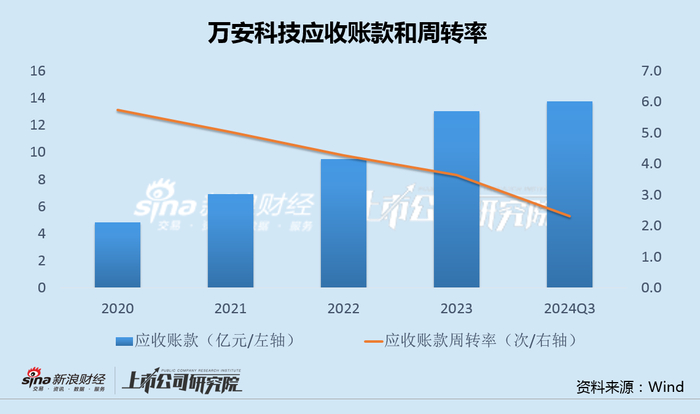 近几年来,万安科技应收账款持续攀升,同时应收账款周转率不断下滑。由于踩中了威马汽车、知豆汽车等破产车企客户,2022年和2023年应收账款坏账损失分别高达2000万元和2500万元。