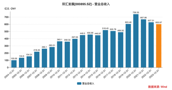经营方面,双飞发展巅峰时期的业绩也是出现在2020年,总营收739.35亿元,归母净利润为62.56亿元。此后便开始逐渐滑坡,2021-2023年营收分别是667.98亿元、627.31亿元、600.97亿元,归母净利润分别为48.66亿元、56.21亿元、50.53亿元。