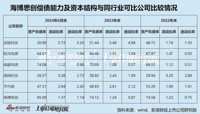 2021年至今年上半年,公司负债规模分别为13.45亿元、48.86亿元、68.43亿元和50.93亿元;资产负债率分别为47.55%、74.58%、74.12%和65.00%,远超同行业平均水平;流动比率分别为 1.85、1.23、1.24和1.37,速动比率分别为1.15、0.75、0.87和1.14,均低于同行业可比公司平均值,且呈现逐年下降趋势。