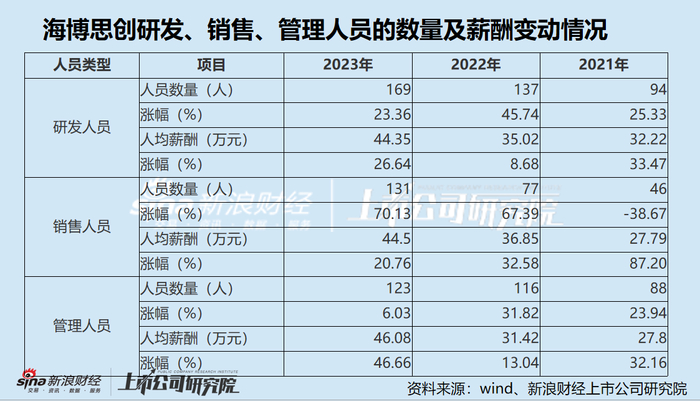 2021年至今年上半年,海博思创研发人员数量分别为94人、137人、169人和254人,占员工总数的比例分别为27.33%、35.96%、25.57%和28.64%。2021年至2023年,公司研发人员的人均薪酬及涨幅明均显低于销售人员和管理人员。