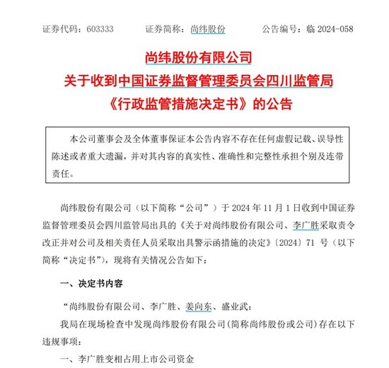 值得一提的是,就在终审获刑之前的11月1日,尚纬股份还发布公告称,李广胜因变相占用上市公司资金、持股情况披露不规范,被证监会四川监管局出具警示函。