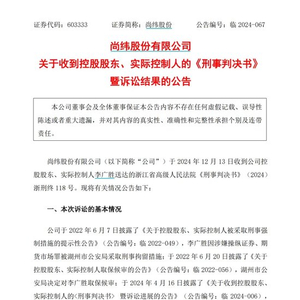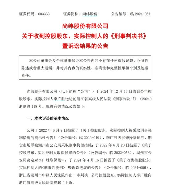 12月16日,主营特种电线电缆的尚纬股份公告称,公司实控人李广胜因犯操纵证券市场罪,终审被判处有期徒刑3年2个月。