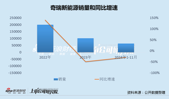 2023年,奇瑞新能源共销售汽车10.19万辆,同比下降49%;2024年1-11月,奇瑞新能源销售汽车63708辆,同比再度下降30%。