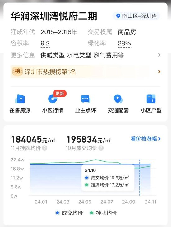 由于该项目是华润置地打造的豪宅项目,事故发生后,华润置地备受关注。贝壳平台显示,深圳湾悦府二期二手房挂牌房源为11套,挂牌均价高达18.4万元/平方米,近一年只成交了一套房,10月成交均价显示为19.58万元/平米。